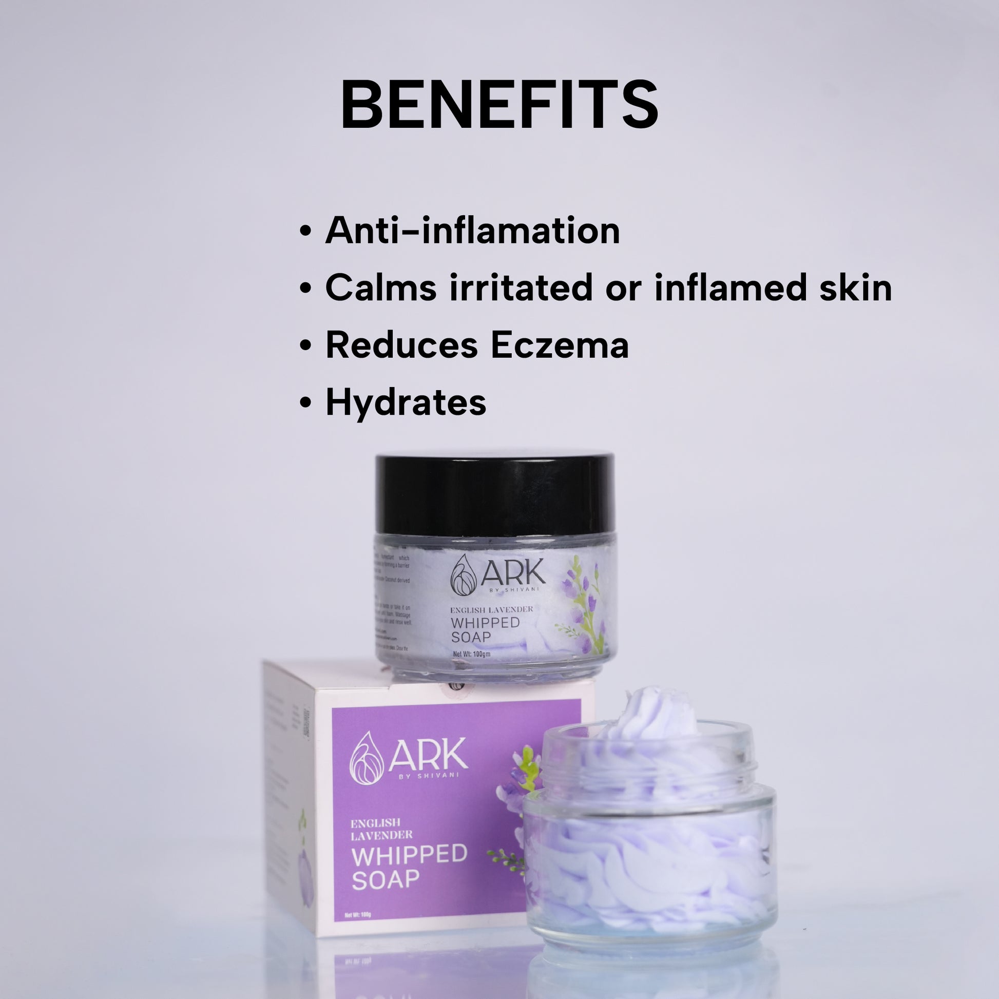Lavender Whipped soap is a cream based luxurious soap made with Richness of Lavender, which reduces stress and calms down your skin. Handcrafted in small batches with high quality plant-based ingredients. Its creamy lather leaves your skin hydrated, calm and clean.