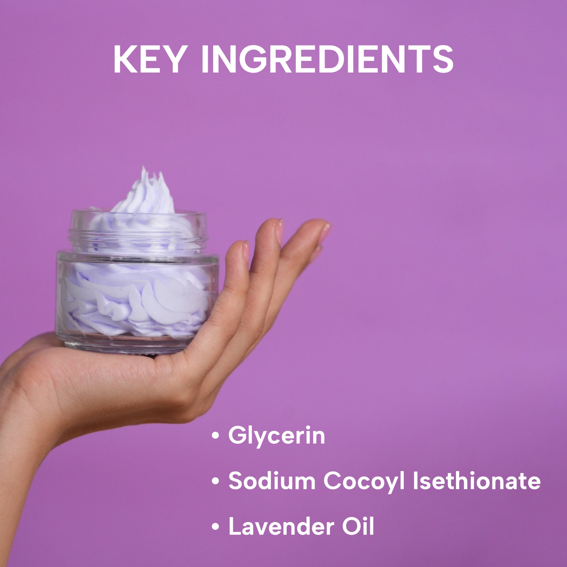 DM Water, Cocamidopropyl betaine, Stearic Acid, Glycerin, Sodium Cocoyl Isethionate, Lavender Extract, Phenoxy Ethanol, Skin safe Fragrance & Pigment