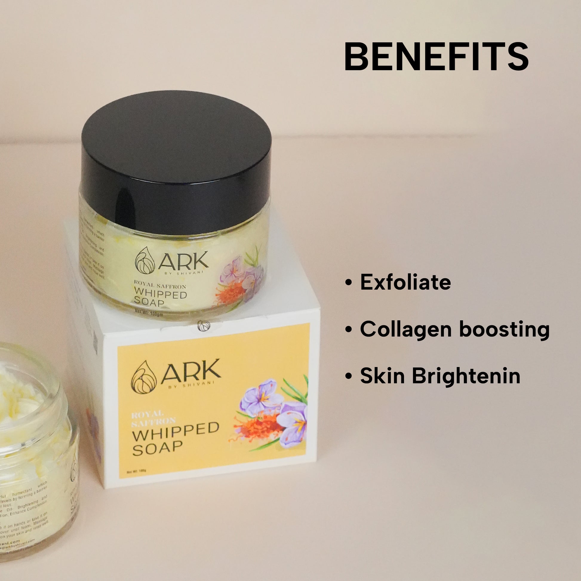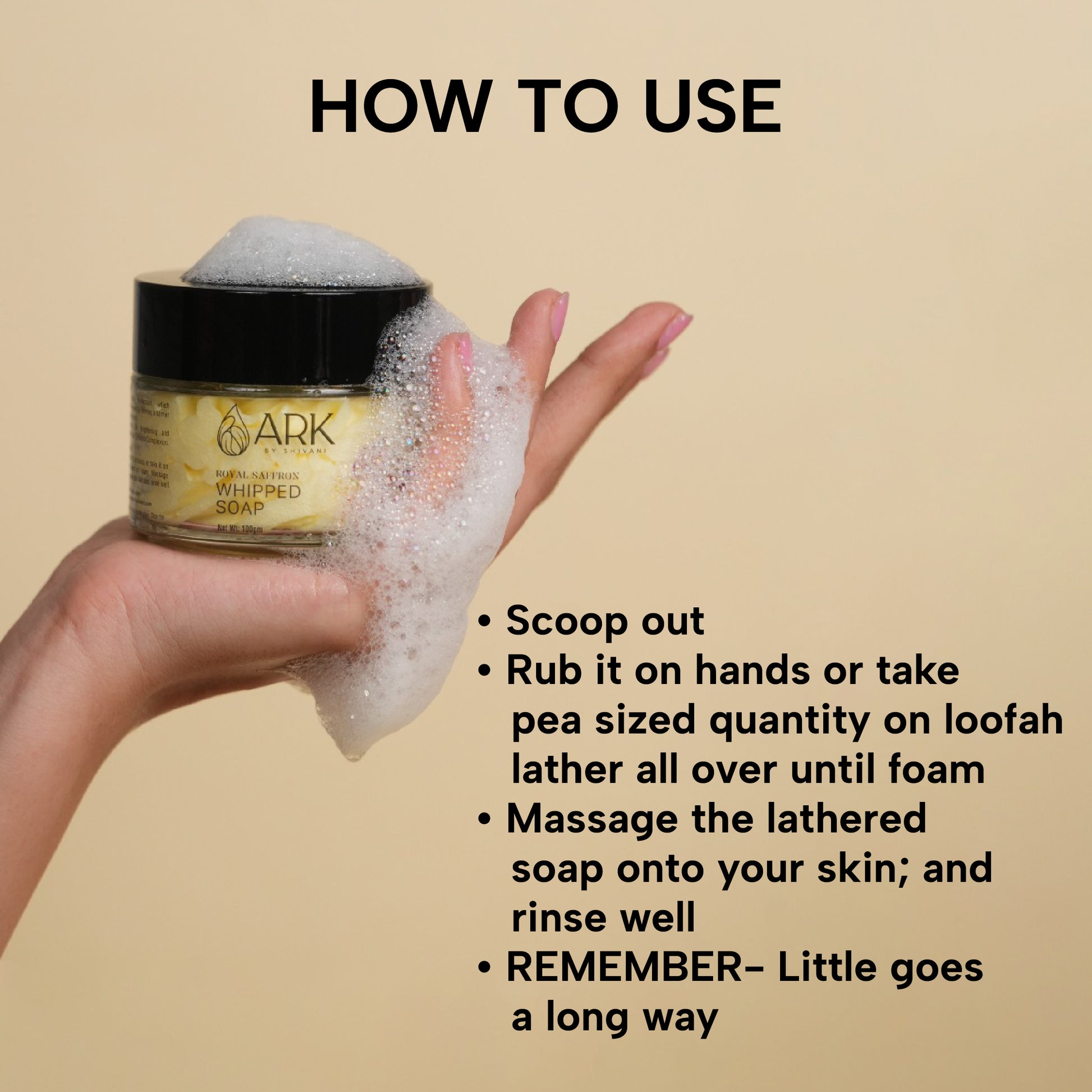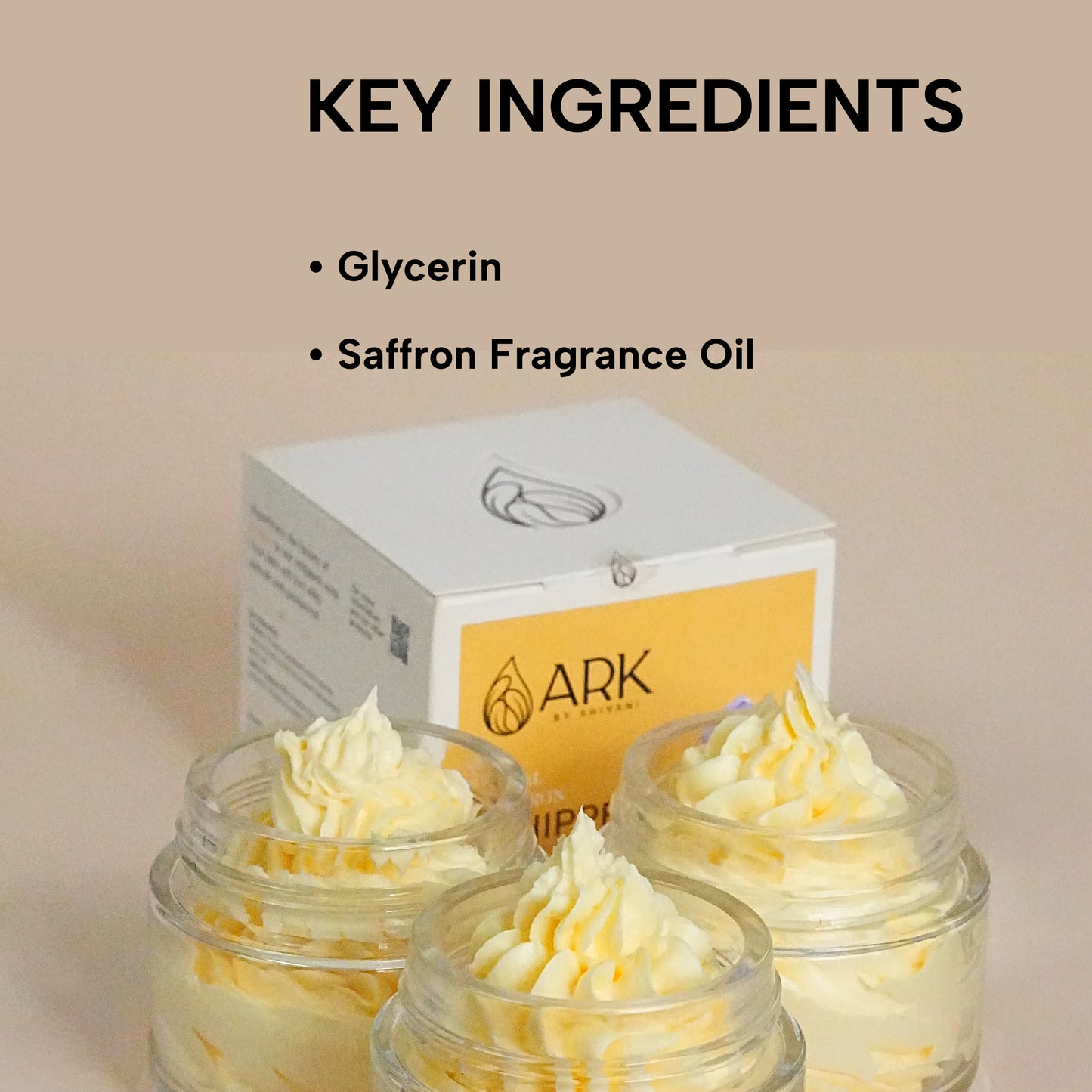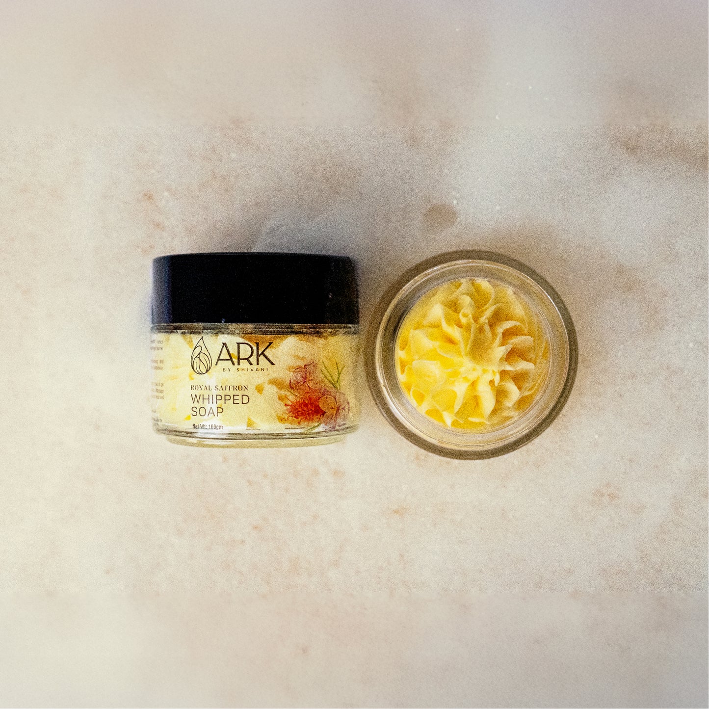 Saffron Whipped soap is a cream based luxurious soap made with Royalness of Saffron, which is antioxidant and lightens dark spots on your skin. Handcrafted in small batches with high quality plant-based ingredients. Its creamy lather leaves your skin with glow, radiance, and youthfulness.